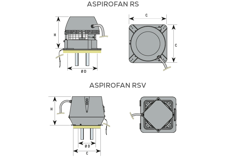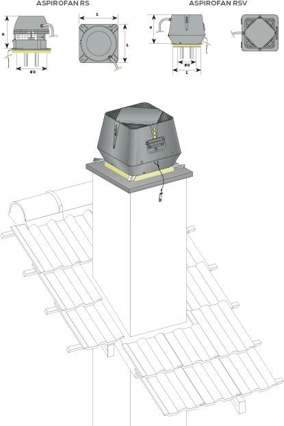 Dostępny w dwóch wersjach: z wyrzutem dymu poziomym (ASPIROFAN RS) lub pionowym (ASPIROFAN RSV).