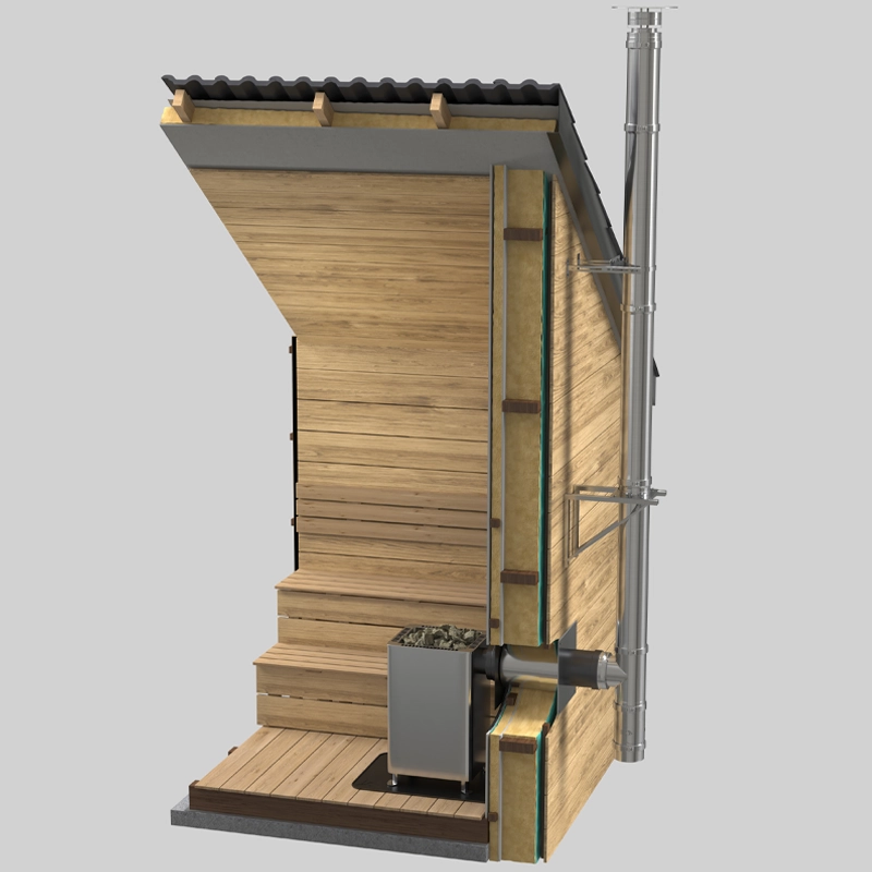- Ciągła izolacja kominowa o grubości 50 mm i gęstości 100 kg/m³. Po zainstalowaniu nie ma mostków termicznych.