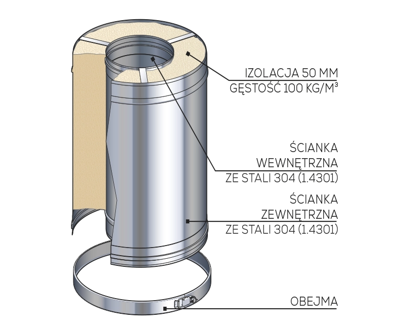 - Ciągła izolacja kominowa o grubości 25 mm i gęstości 100 kg/m³. Po zainstalowaniu nie ma mostków termicznych.