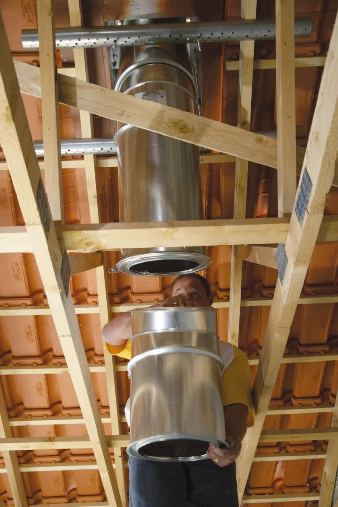 Po pierwsze – BEZPIECZEŃSTWO. System DUALINOX WG jest izolowanym systemem kominowym łączonym kielichowo, zabezpieczonym przed powstawaniem mostków termicznych i gwarantujący szczelność. Odpowiednio zmontowany daje pełną gwarancję na to, że nie rozłączy się w trakcie eksploatacji ani nie przeniesie nadmiernej temperatury na płaszcz zewnętrzny. Podwieszany nie wymaga fundamentu = OSZCZĘDNOŚĆ PRACY. Nie wymaga obudowywania = OSZCZĘDNOŚĆ MIEJSCA. Szybki montaż = OSZCZĘDNOŚĆ CZASU. Jak zatem zamontować komin bez fundamentu, zajmujący mało miejsca i w krótkim czasie? Wystarczy nie wylewać fundamentu pod komin i zrobić odpowiedniej wielkości otwory w stropach celem zabezpieczenia zarówno przejścia komina przez kondygnacje, jak i odległości od materiałów palnych przewidzianych prawem budowlanym dla odpowiedniego typu kominów.