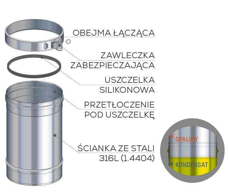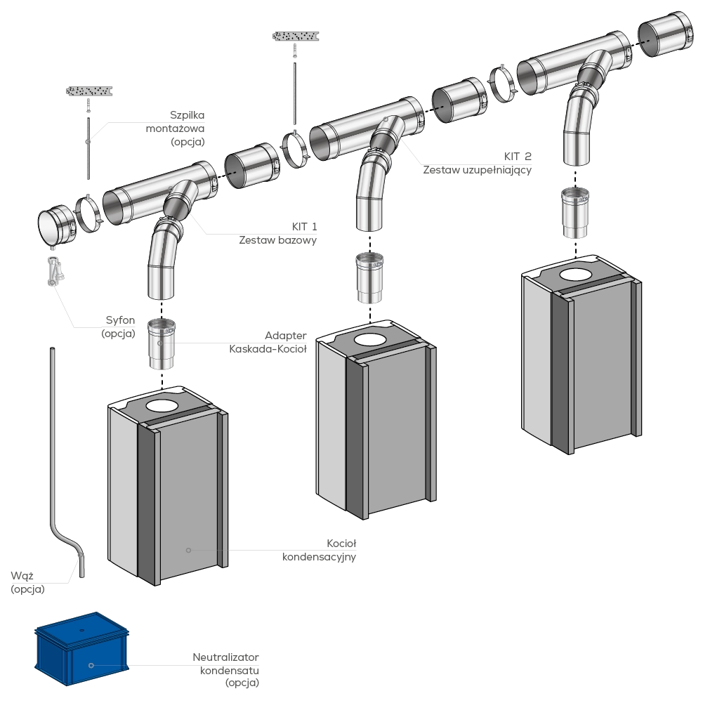 - System kaskadowy w średnicach 130-250 jest dedykowany do instalacji pracujących w trybie mokrym (kondensat) oraz kotłów pracujących w konfiguracji B22P / B23P.