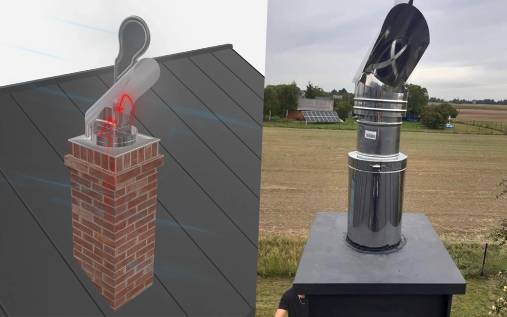 Nieobracający się „strażak” nie tylko nie ustawi się zgodnie z kierunkiem wiatru, ale może zacząć dodatkowo „łapać” wiatr. Wsteczny ciąg w wietrzny dzień może wtłaczać dym i sadzę do wnętrza, a brak tlenu przy spalaniu stworzyć zagrożenie czadem!