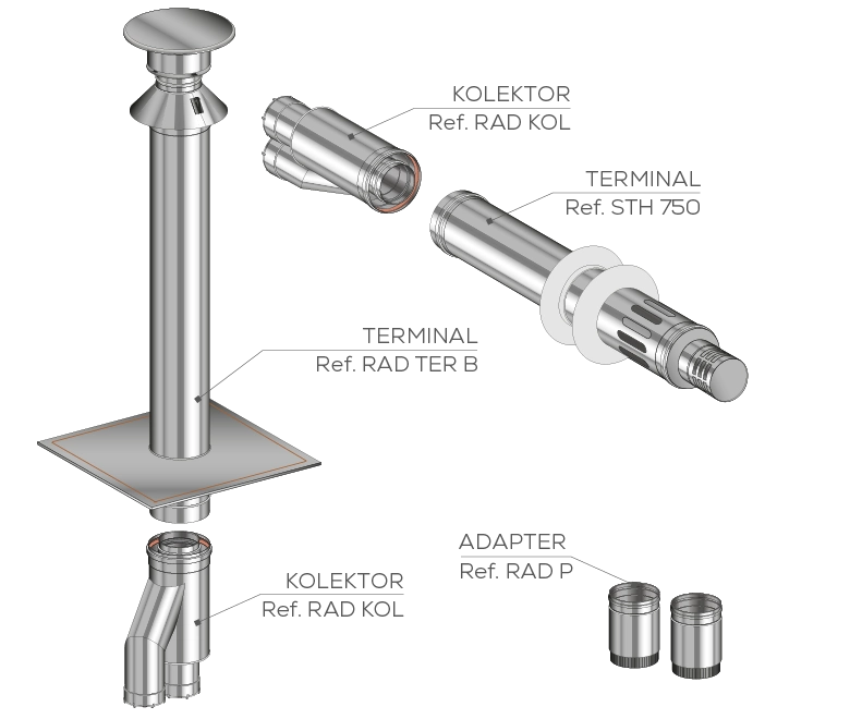 Konstrukcja ZESTAWU DO PROMIENNIKÓW oparta jest na systemie DUAL WG z wykorzystaniem dwóch współosiowych przewodów, z których wewnętrzny (spalinowy) odprowadza spaliny na zewnątrz do atmosfery, natomiast zewnętrzny (powietrzny) pobiera powietrze z otoczenia.
